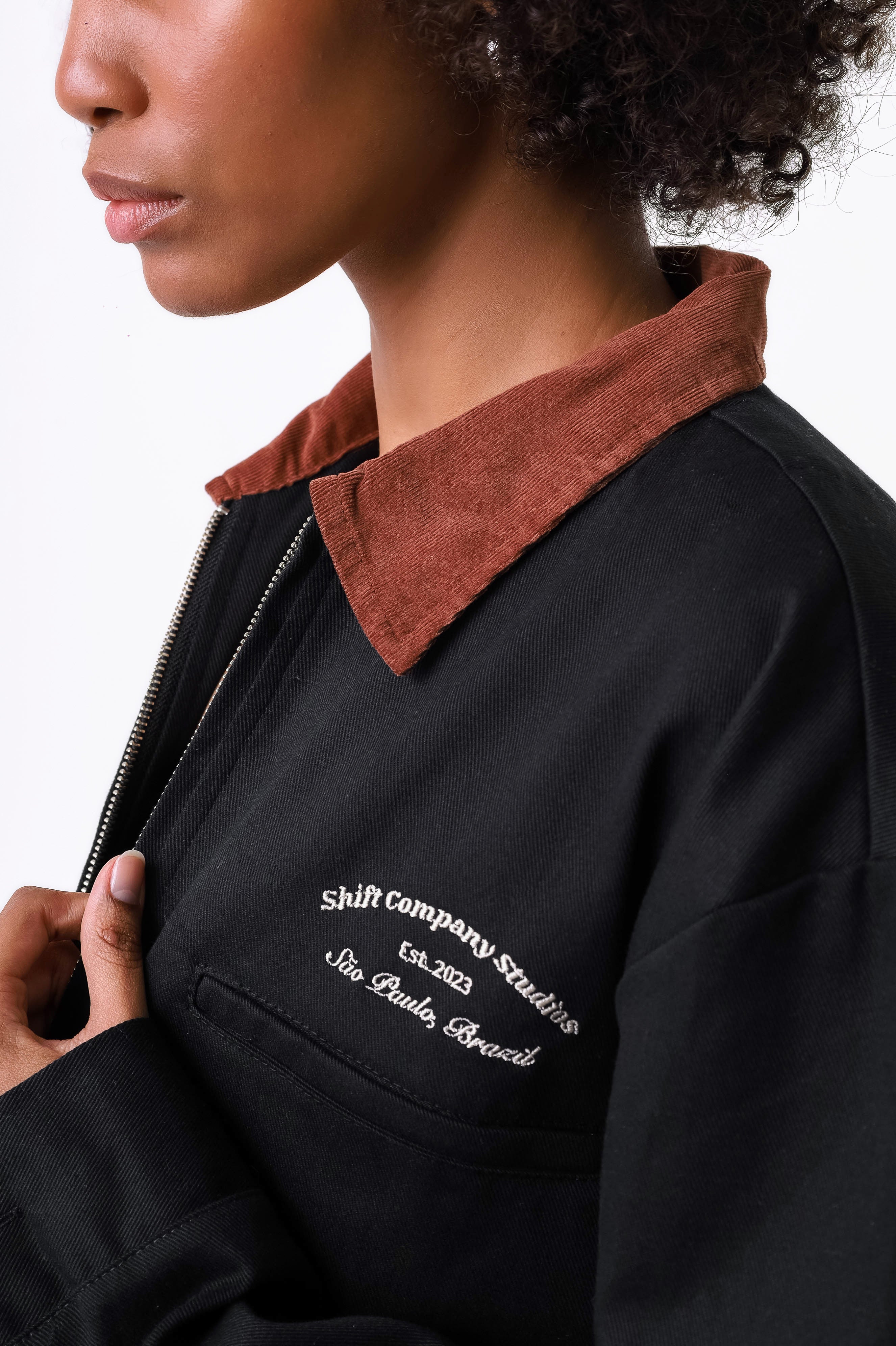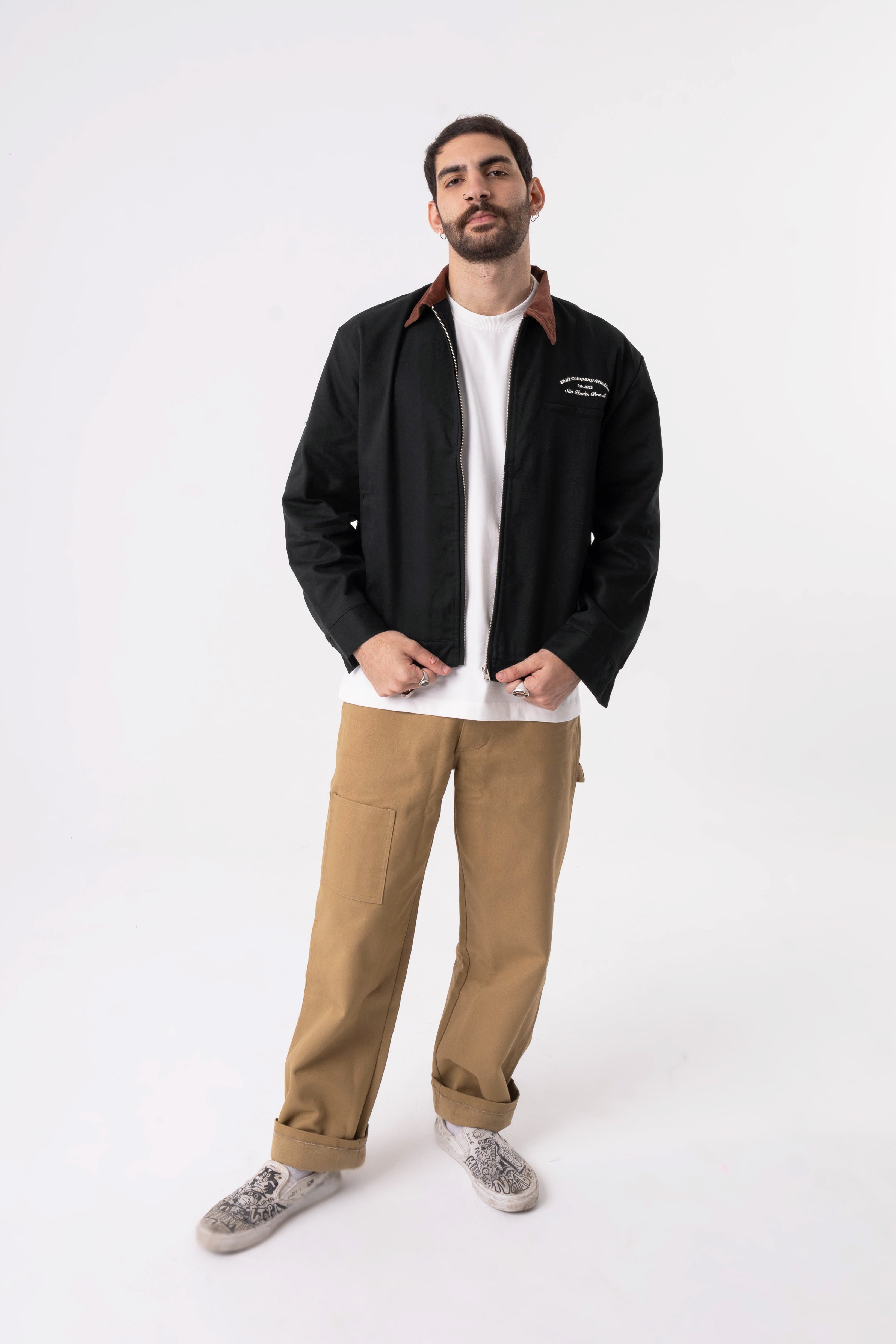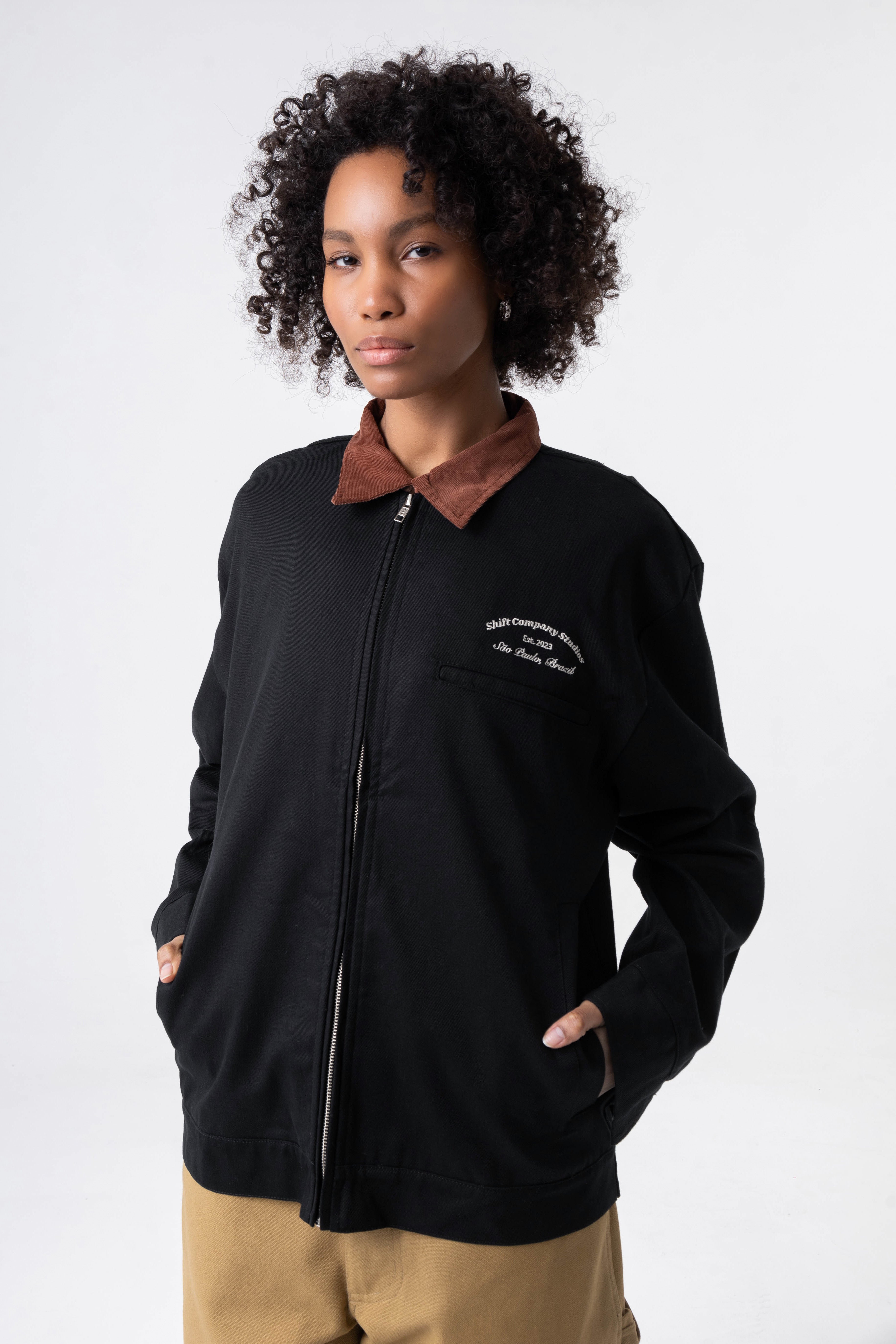 A Worker Jacket Shift tem uma modelagem "boxy" e é confeccionada em sarja pesada. Carrega 2 bolsos no quadril e 1 no peito, alem de trazer o bordado "Shift Company Studios" no peito.