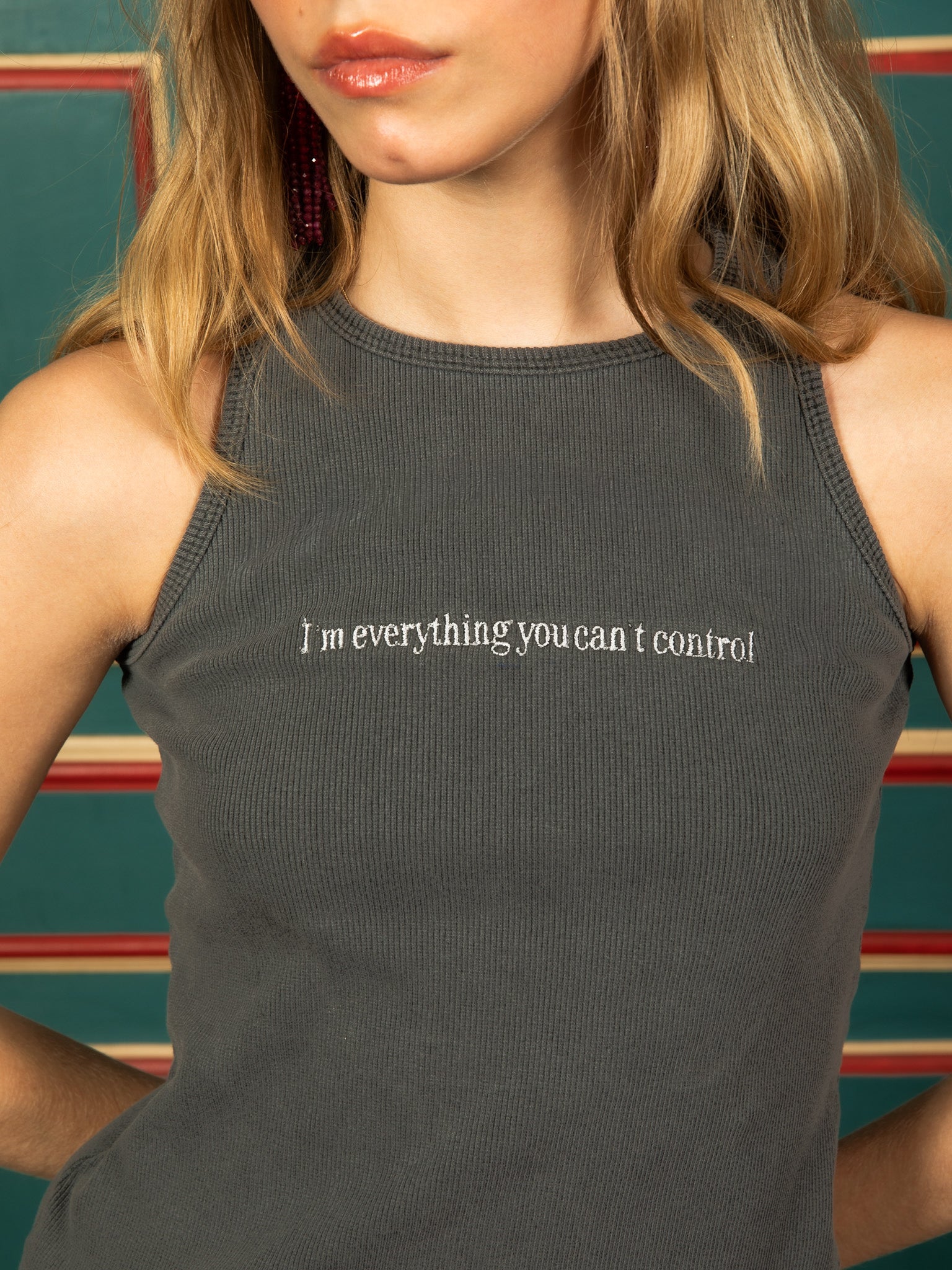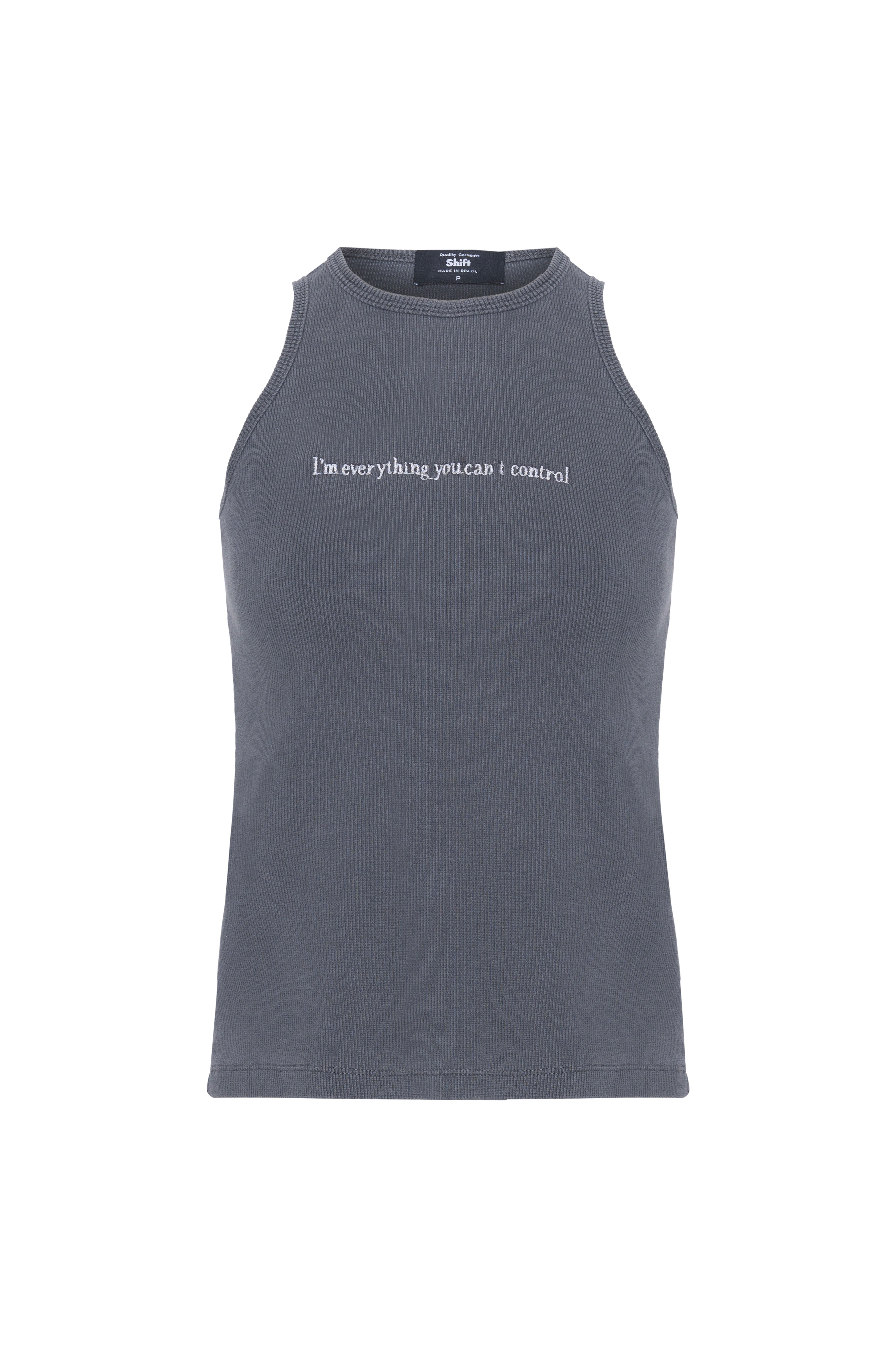 A regata Can’t Control tank cinza possui uma modelagem justa, e uma lavagem vintage. Confeccionada em malha canelada 95% em algodão e 5% elastano. Na frente carrega o bordado com a frase “I’m everything you can’t control” e tem as costas lisas.