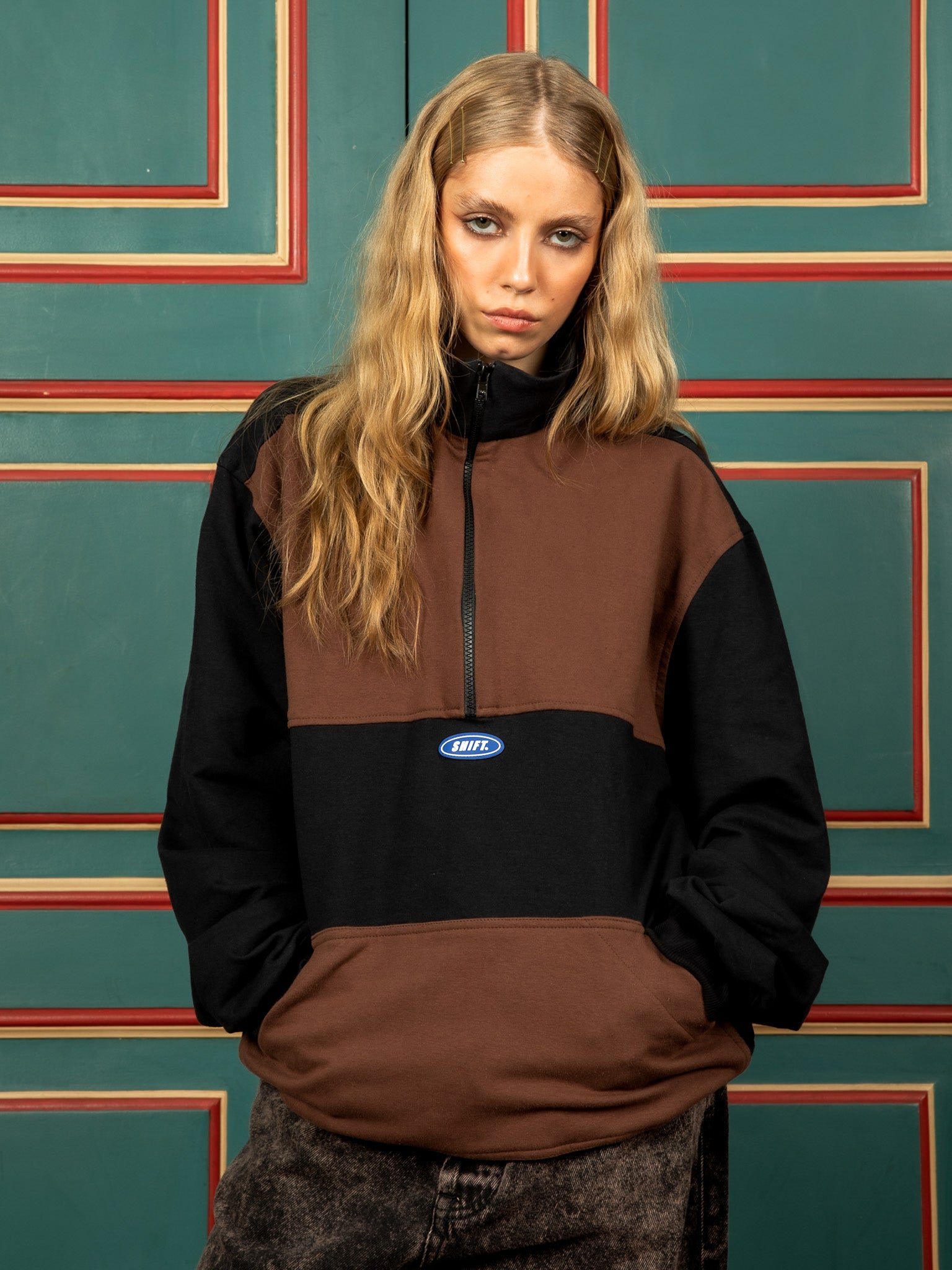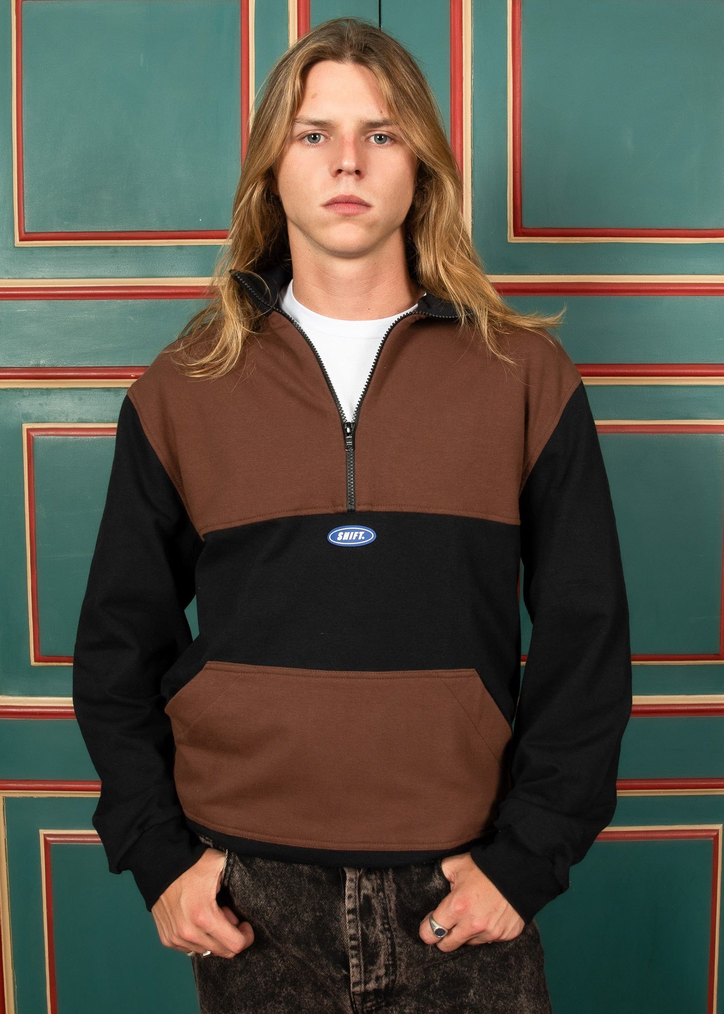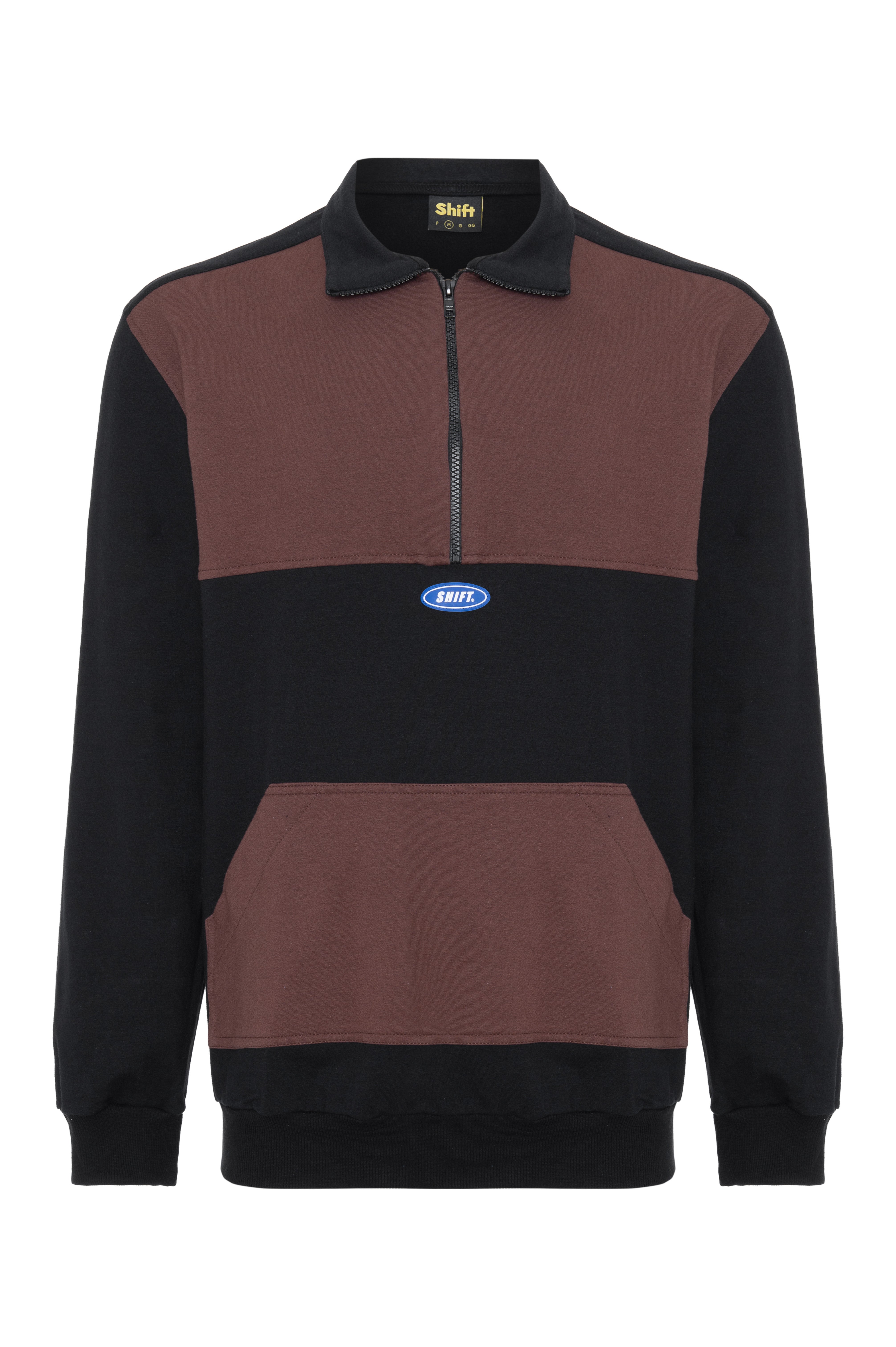 O moletom quarter zip marrom possui nossa modelagem “relaxed”, confeccionado em algodão 100%. Ele traz um zíper 1/4 e nossa etiqueta shift de borracha na frente. Tem os detalhes da frente em marrom e as costas e mangas pretas.