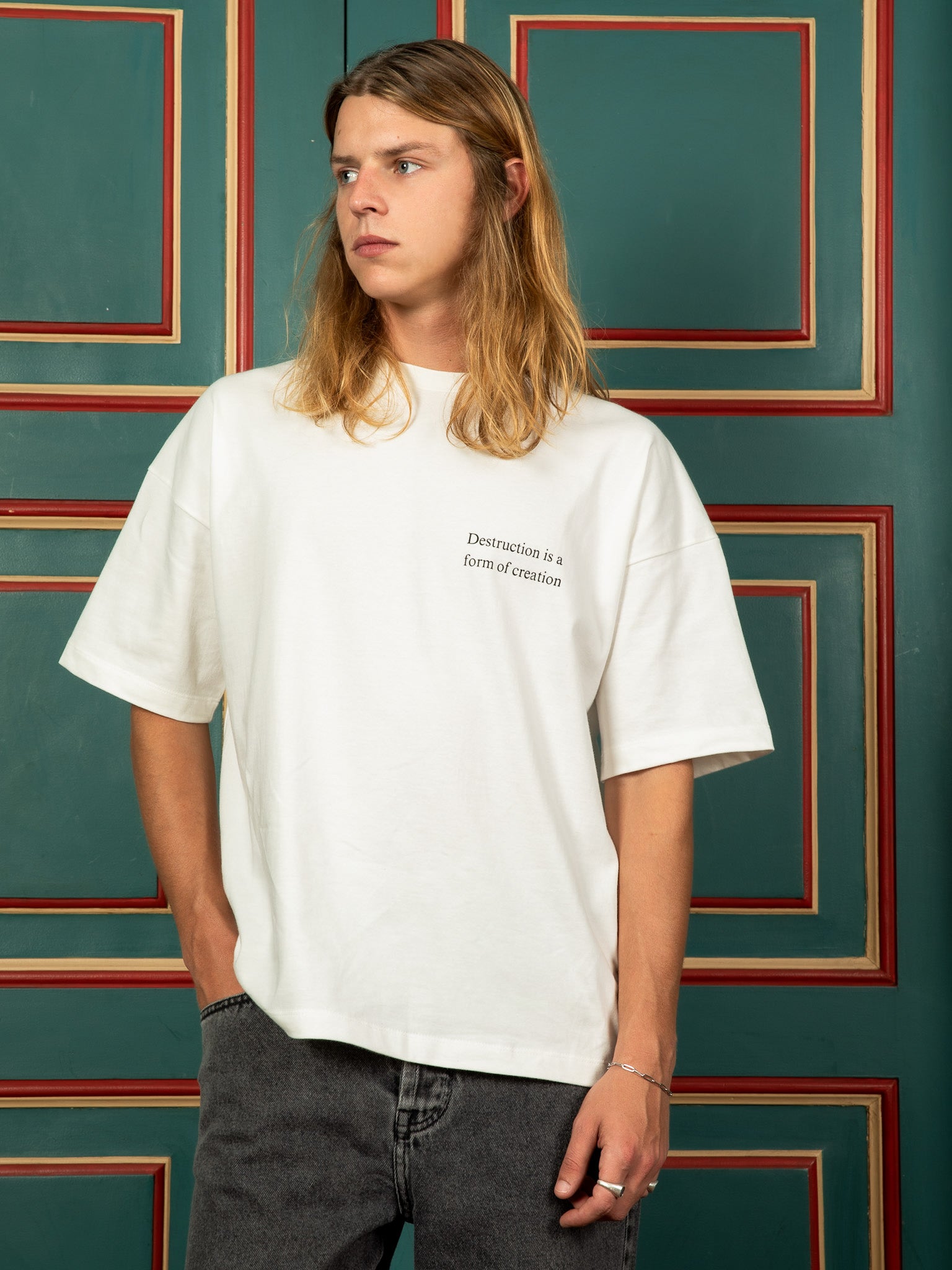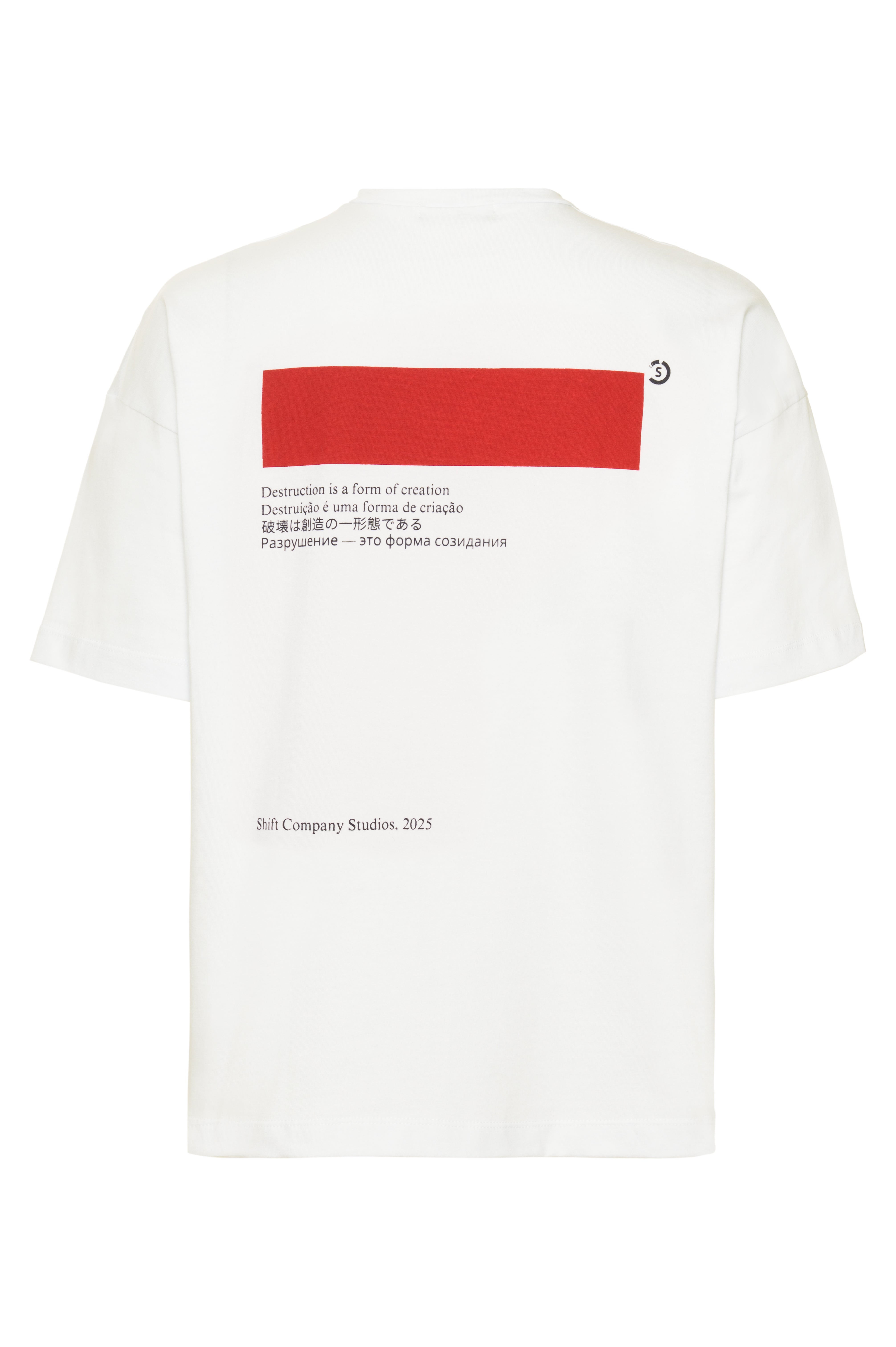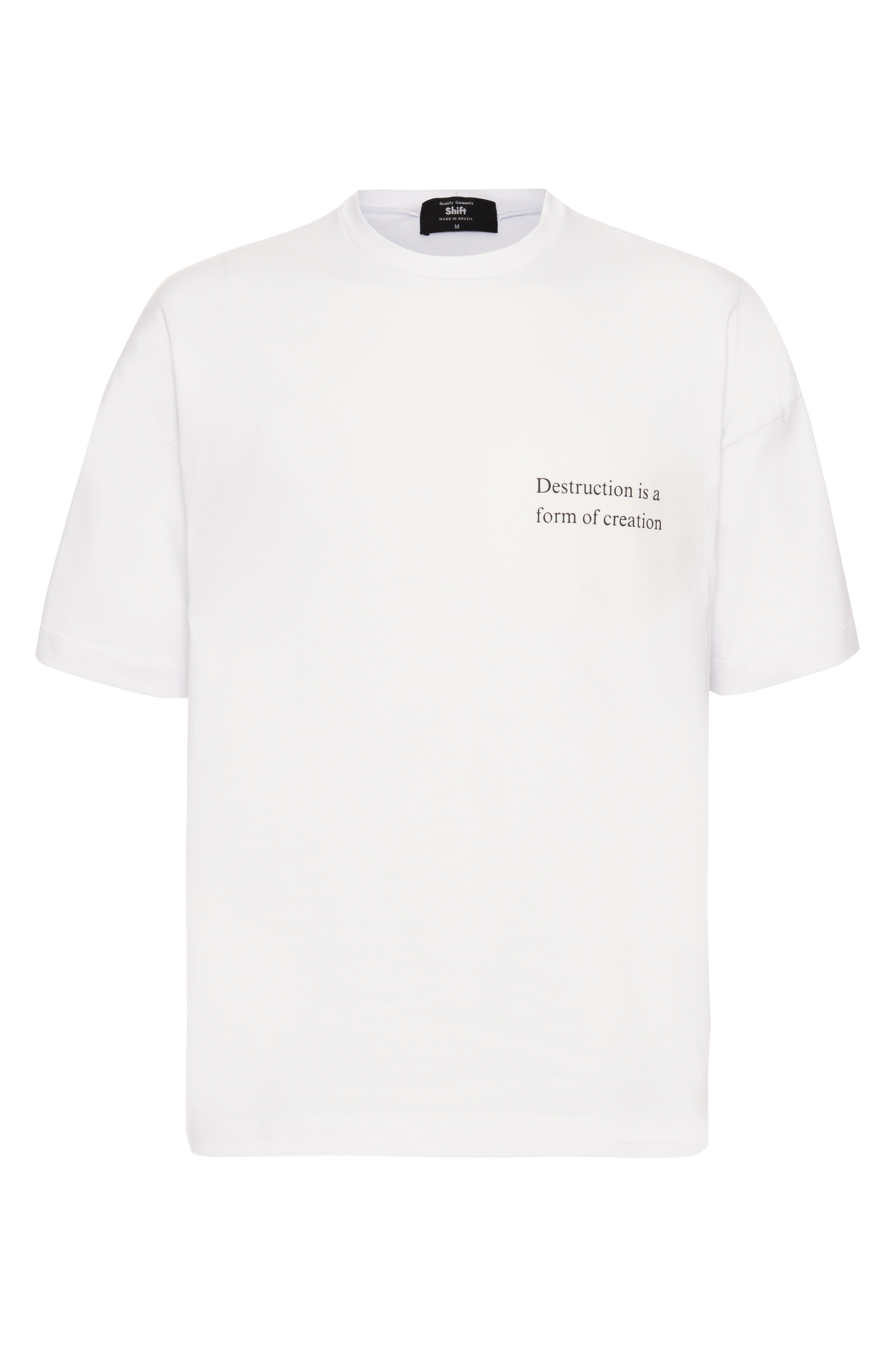 A camiseta Destruction em off-white possui nossa modelagem oversize, confeccionada em malha premium 100% algodão. Carrega a estampa “Destruction is a form of creation” na frente e a arte nas costas.