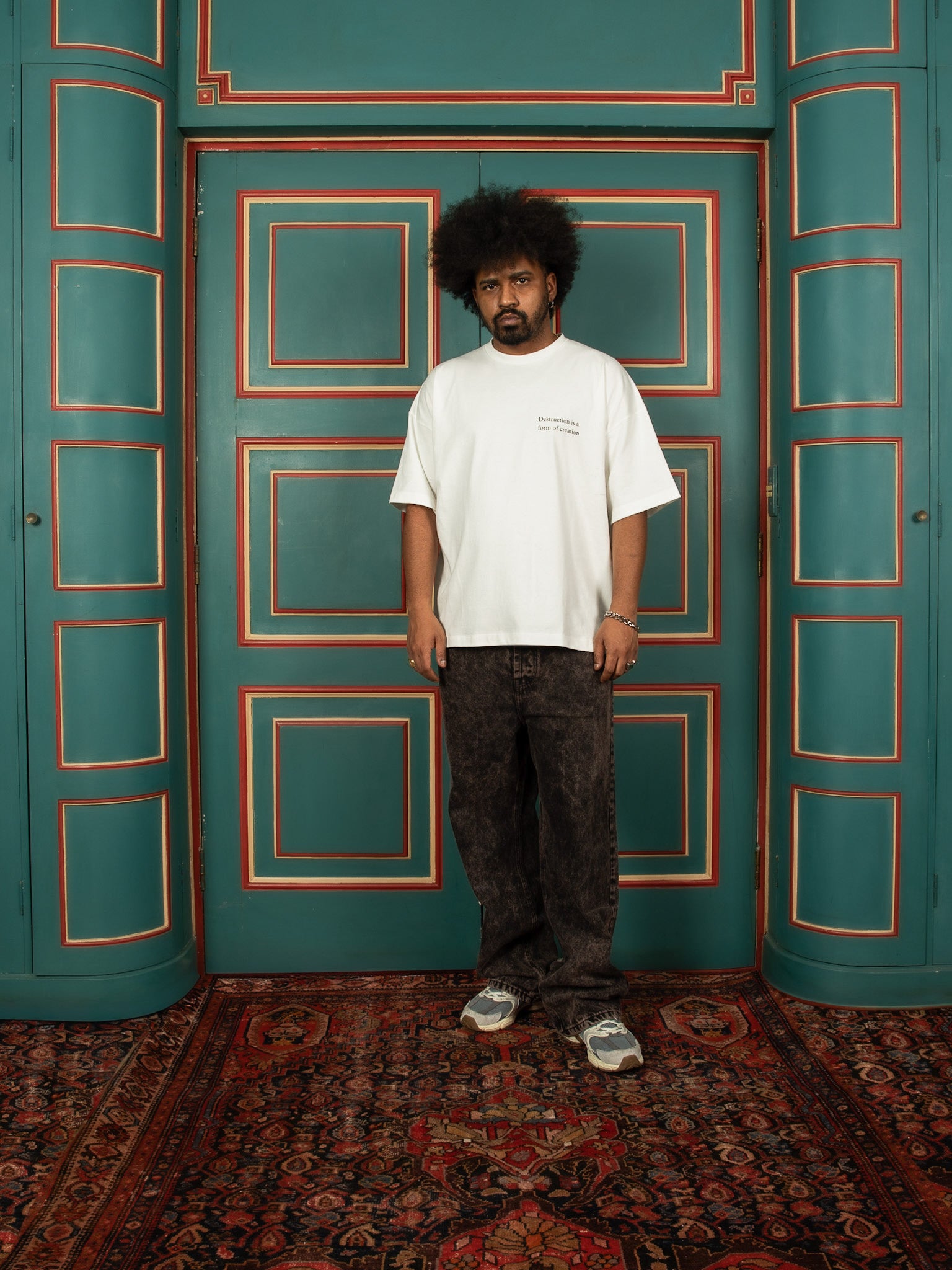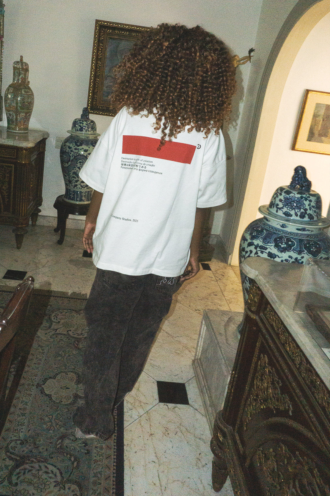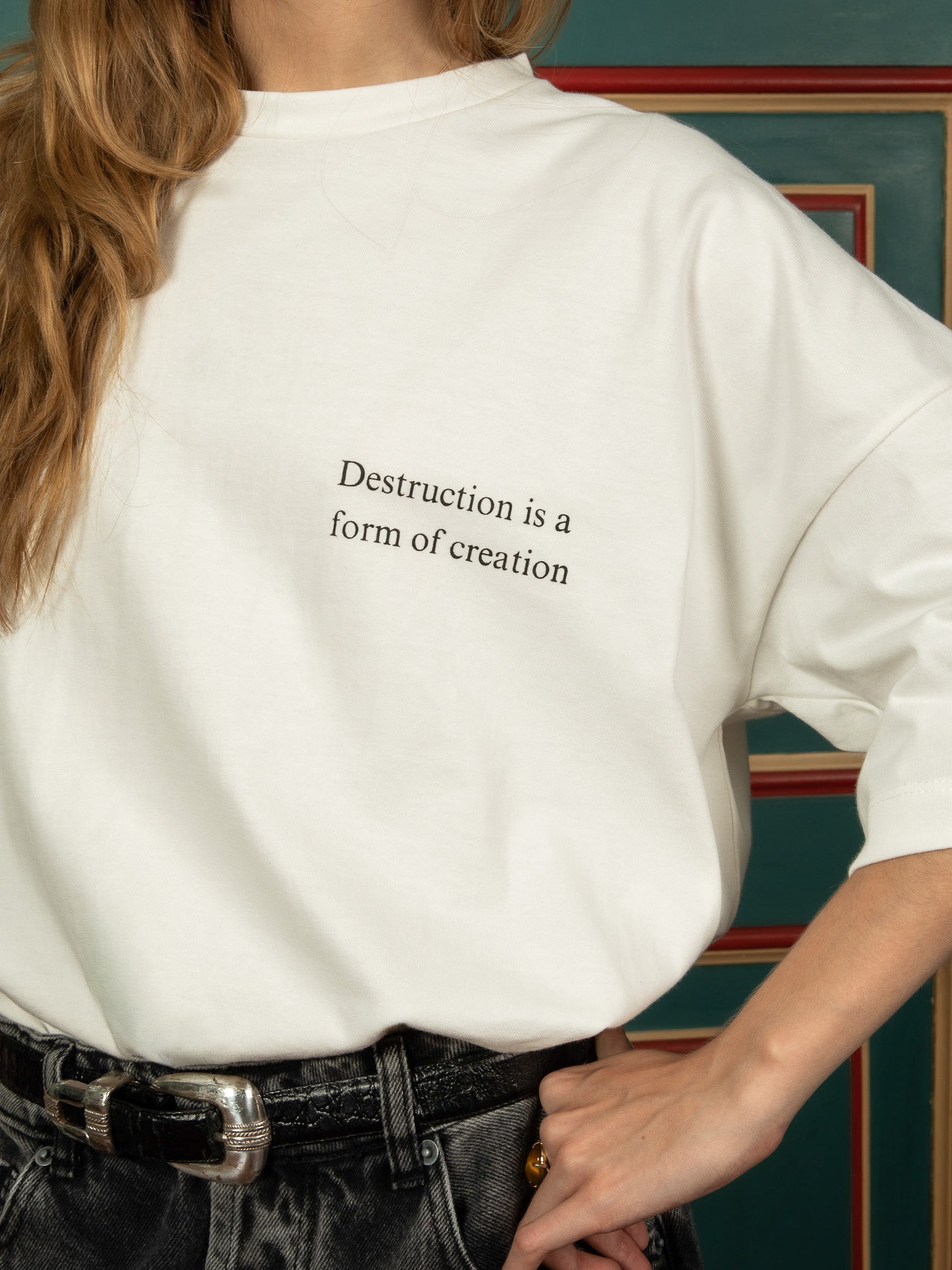 A camiseta Destruction em off-white possui nossa modelagem oversize, confeccionada em malha premium 100% algodão. Carrega a estampa “Destruction is a form of creation” na frente e a arte nas costas.