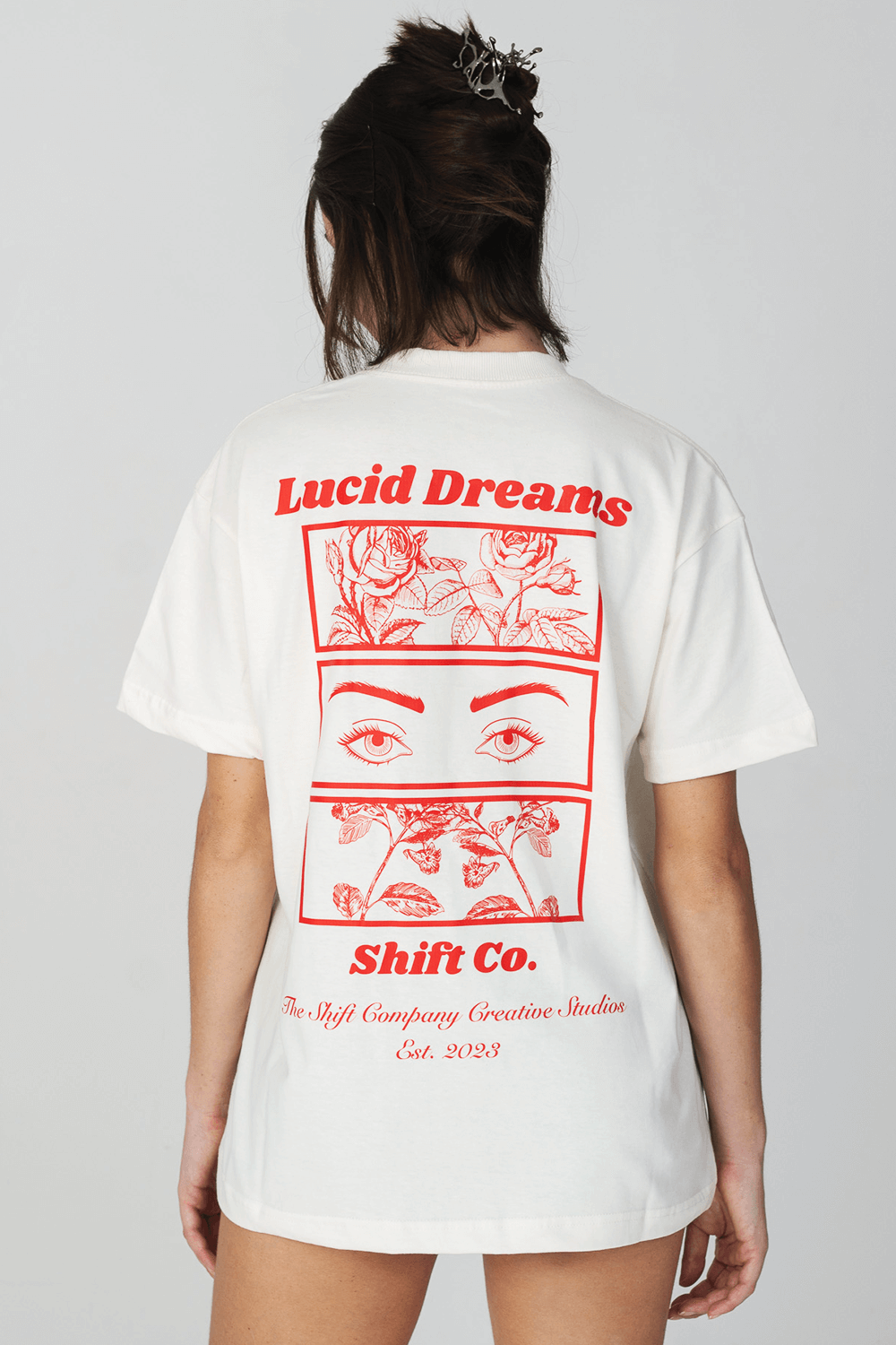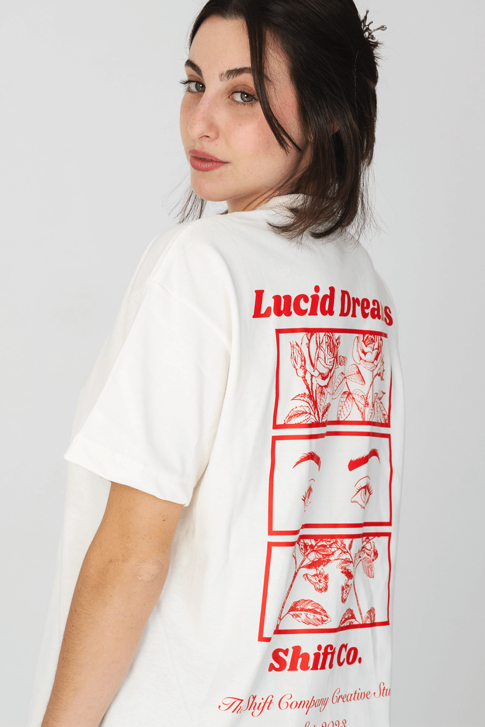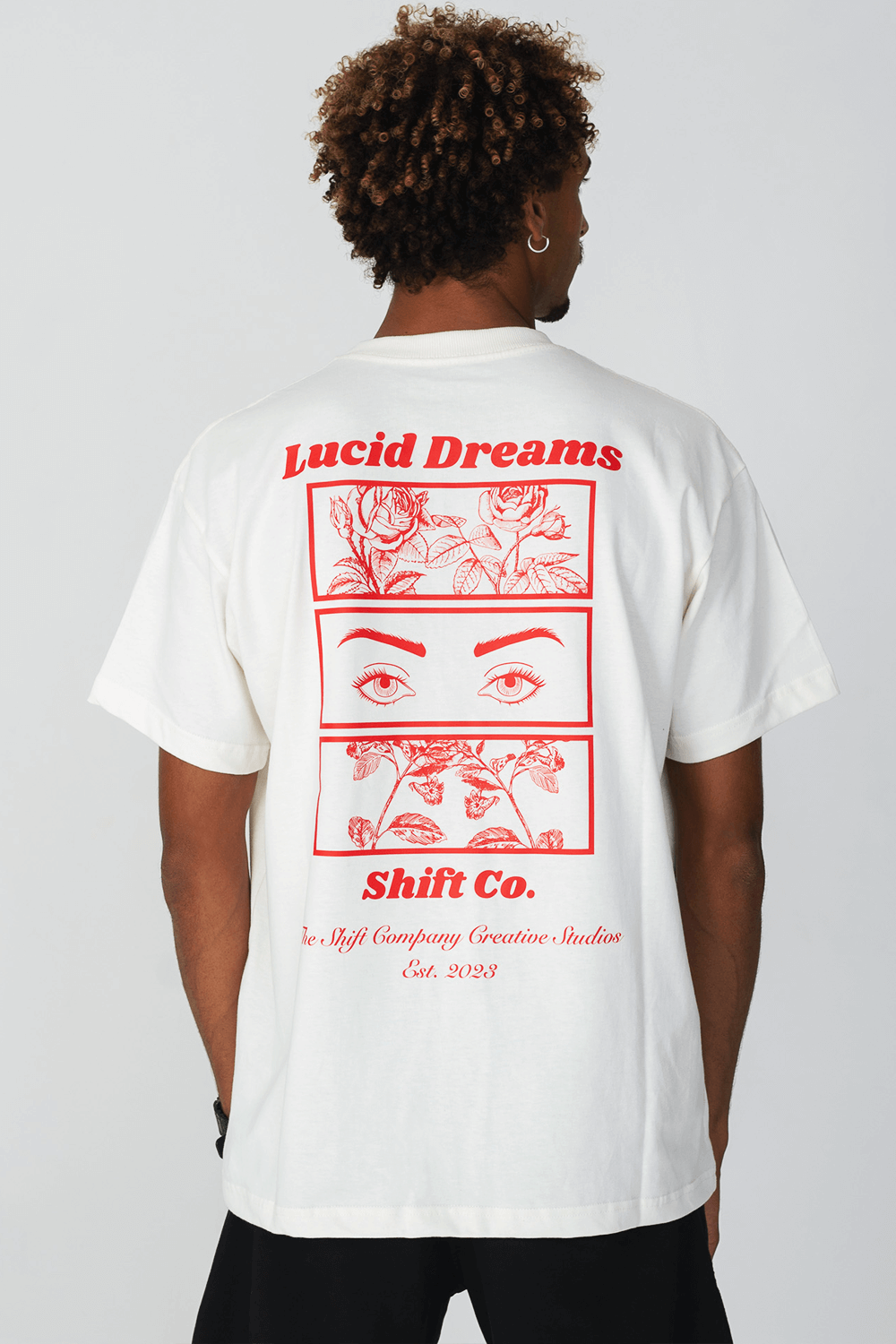 A T-Shirt Lucid Dreams off-white possui nossa modelagem ampla (relaxed fit) confeccionada em malha premium 100% algodão. Na frente carrega “Shift Co” e nas costas a estampa Lucid Dreams.