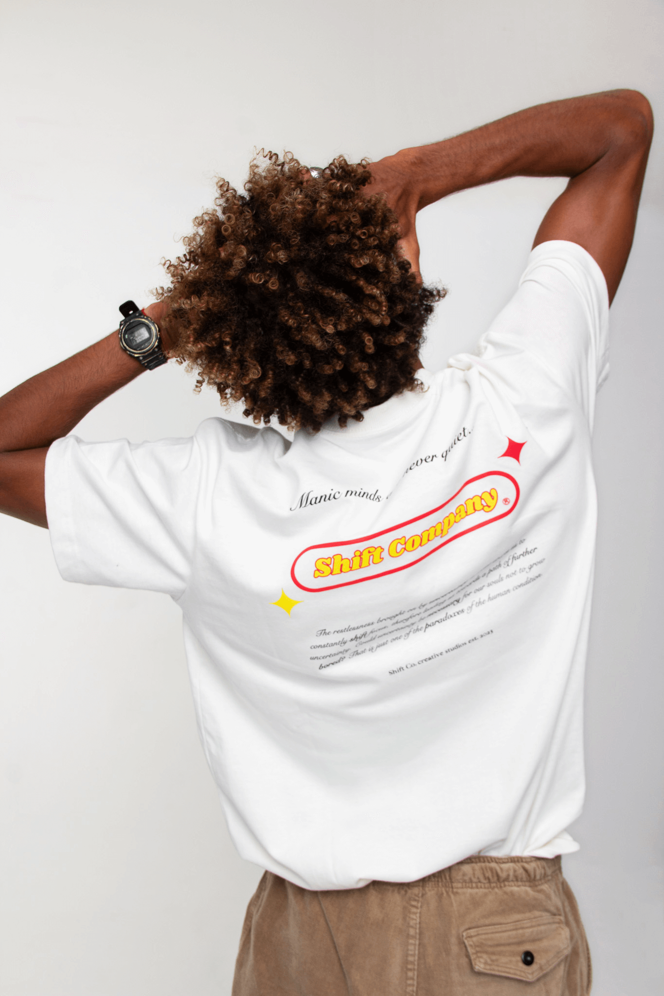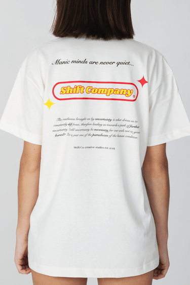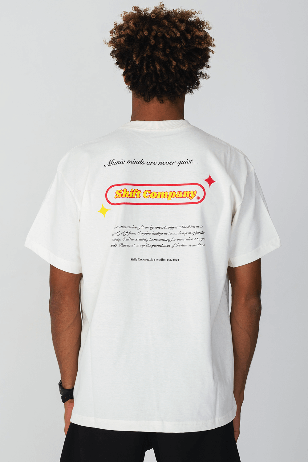 A T-Shirt Manic Minds off-white possui nossa modelagem ampla (relaxed fit) confeccionada em malha premium 100% algodão. Na frente carrega “Shift Company” e nas costas a estampa Manic Minds.